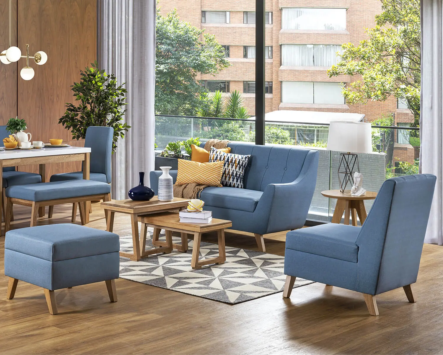 Explora la serenidad del azul, para lograr un ambiente relajado y equilibrado. Desde tonos suaves hasta azules profundos, esta paleta complementa perfectamente la madera, proporcionando una sensación de frescura y tranquilidad. Puedes probar el azul en elementos como poltronas y sofás para crear una elegante armonía.